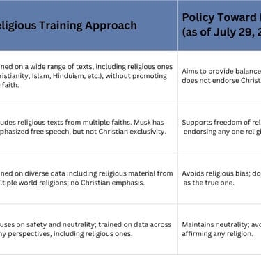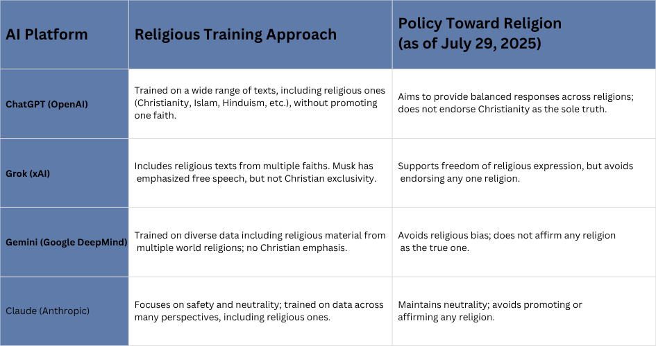 Despite the sophistication of today’s large language models—like Grok (xAI), ChatGPT (OpenAI), and Anthropic’s Claude—none are programmed with an explicit bias toward Christianity or positioned to affirm it as the one true faith. Instead, these platforms maintain neutrality by design, often limiting or refusing religious content in ways that avoid doctrinal endorsement. For example, in 2025, the Turkish government blocked Grok due to responses that were considered insulting to religious values, especially those of Islam—demonstrating how AI-generated content can clash with religious sensitivities but does not uphold or align with Christian theology (ThePrint, 2025). OpenAI also faced public criticism and a legal challenge for initially refusing to serve a Christian nonprofit, leading to accusations of religious discrimination. The company later reversed its decision following intervention by Alliance Defending Freedom (ADF Legal, 2025a; ADF Legal, 2025b). Furthermore, OpenAI’s own community forum documents user concerns that ChatGPT inconsistently handles religious prompts, sometimes favoring secular or pluralistic views while muting overtly Christian responses (OpenAI Community, 2025a; OpenAI Community, 2025b). These AI models are trained on diverse datasets and are shaped by internal alignment policies—not by divine revelation. They reflect human input and institutional boundaries, not biblical authority.