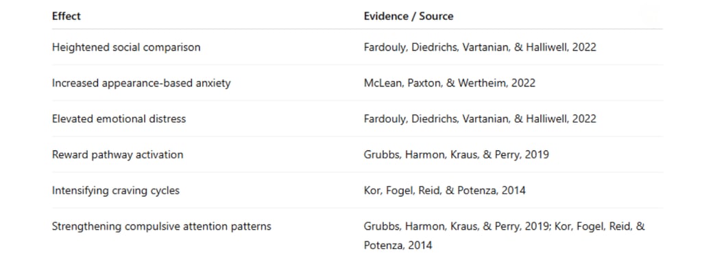 Research shows that exposure to sexualized imagery on social media produces effects strikingly similar to those documented in pornography addiction: